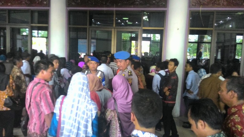 SOROT – Ratusan pengunjung dalam acara pelantikan dan pengambilan sumpah jabatan kepala desa terpilih di Kabupaten Paser, Jumat (3/2/17) terpaksa harus menunggu di luar Gedung Awa Mangkuru Tanah Grogot, tempat acara tersebut berlangsung.