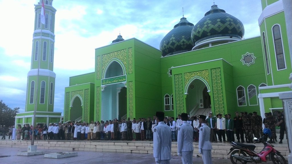 Setelah acara doa bersama 171717 dengan tema “Indonesia Lebih Kasih Sayang” itu selesai, lalu mereka keluar menuju halaman masjid mengambil shaf atau barisan mengikuti acara penurunan bendera.
