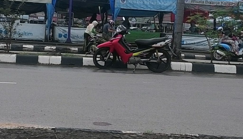 SOROT – Seorang ibu, pengendara roda dua, tiba-tiba memarkir kendaraannya tepat didekat pembatas tengah, jalan Jend Sudirman Tanah Grogot, Kabupaten Paser, Kaltim, Rabu (7/3/18).