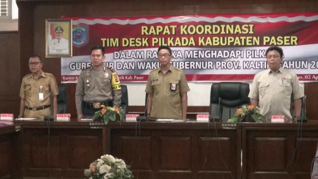 SOROT – Jelang Pemilihan Kepala Daerah (Pilkada) Provinsi Kaltim, Tim Dukungan Elemen Satuan Kinerja (Desk) Pilkada Kabupaten Paser menggelar rapat koordinasi (rakor), Senin (2/4/18), di ruang rapat Sadurengas Kantor Bupati Paser.