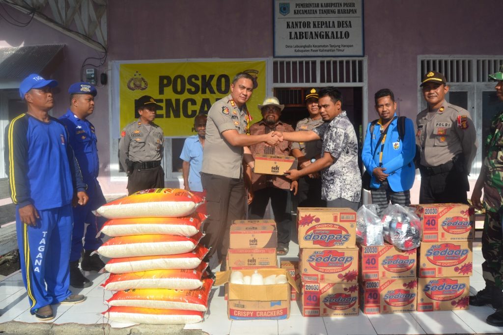 Didampingi Kabag Ops Polres Paser Kompol Bargas Hartoko dan Kapolsek Tanjung Harapan Iptu Hermawan, Kapolres menyerahkan bantuan tersebut melalui Kepala Desa (Kades) Labuangkallo Syahran.