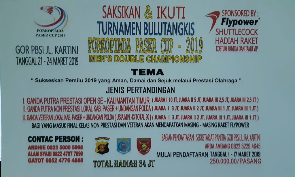 Dikatakan, Turnamen Bulutangkis Forkopimda Paser Cup 2019 se Kaltim itu dihelat pada 21-24 Maret 2019, di Gedung Bulutangkis PBSI, Jalan RA Kartini Tanah Grogot, Kabupaten Paser, Kaltim.