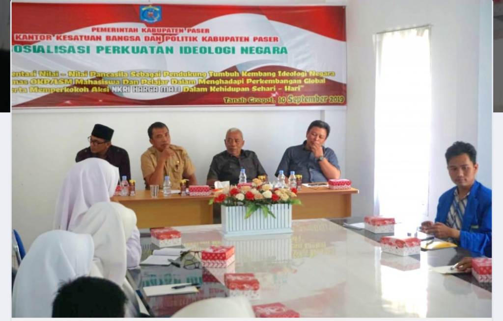 SOROT – Kantor Kesatuan Bangsa dan Politik (Kesbangpol) Kabupaten Paser, Kalimantan Timur, gelar sosialisasi penguatan ideologi negara dalam rangka implementasi nilai-nilai Pancasila di kalangan remaja, Selasa (10/9/19).