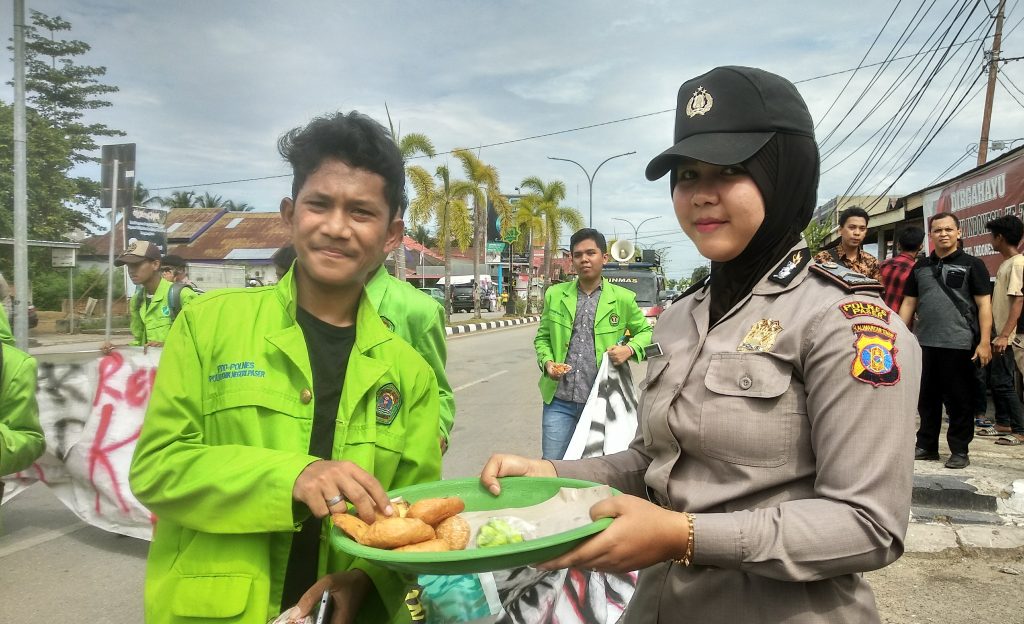 Para polwan cantik itu bukan berarti menghalangi AMP, menuju DPRD melakukan unjukrasa menyampaikan aspirasi terkait penolakan RUU KUHP, pembatalan UU KPK, melainkan membagikan kue dan air minum.