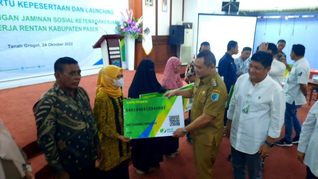 SOROTONLINE.COM – Penyerahan kartu kepesertaan dan launching program perlindungan jaminan sosial ketenagakerjaan berlangsung di Pendopo Kabupaten Paser, Senin (24/10/2022).