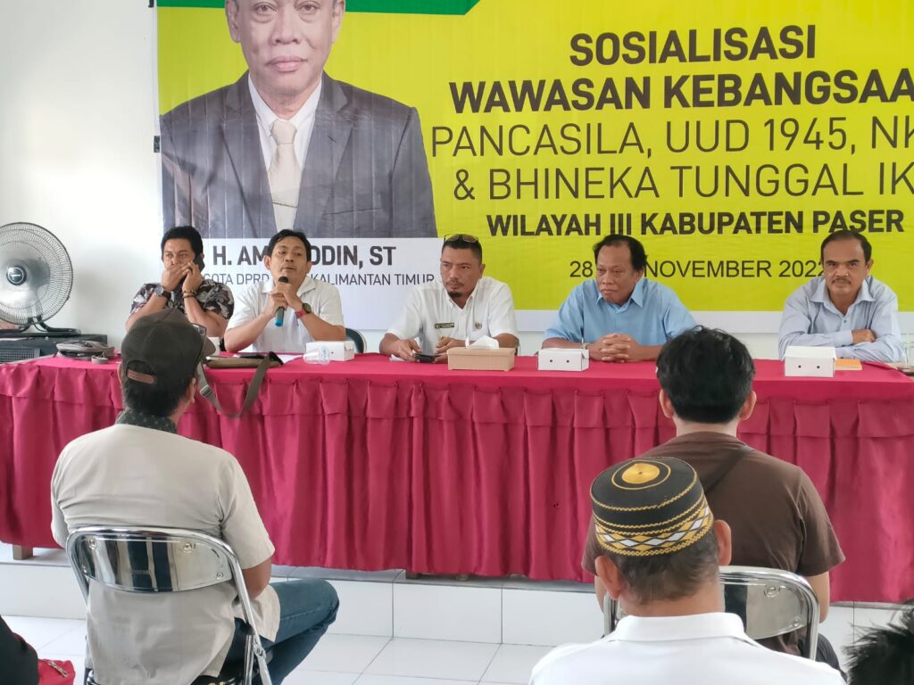 SOROTONLINE.COM – Anggota DPRD Provinsi Kalimantan Timur, H. Amiruddin menggelar sosialisasi empat pilar kebangsaan (Pancasila, UUD 1945, NKRI, Bhinneka Tunggal Ika) di Desa Sangkuriman, Kecamatan Pasir Belengkong), Rabu (30/11/2022).