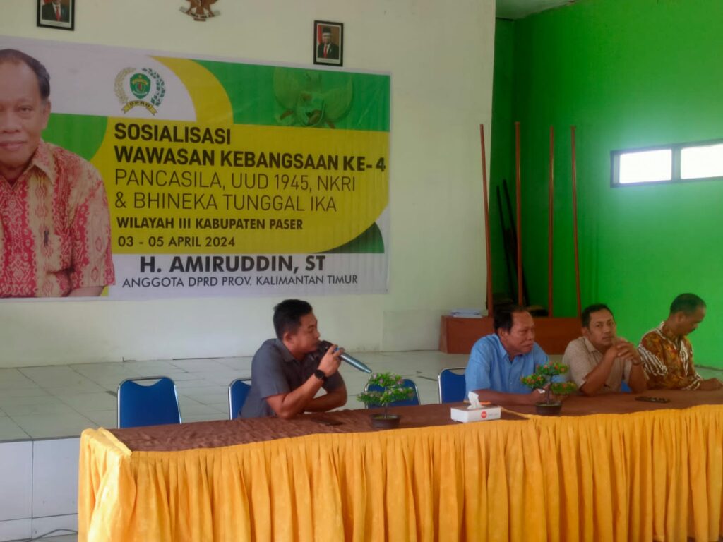 SOROTONLINE.COM – Anggota DPRD Kaltim H. Amiruddin menggelar sosialisasi empat pilar wawasan kebangsaan kepada warga Tanah Grogot Kabupaten Paser, di aula SMP 5 Tanah Grogot, Minggu (7/4/2024).