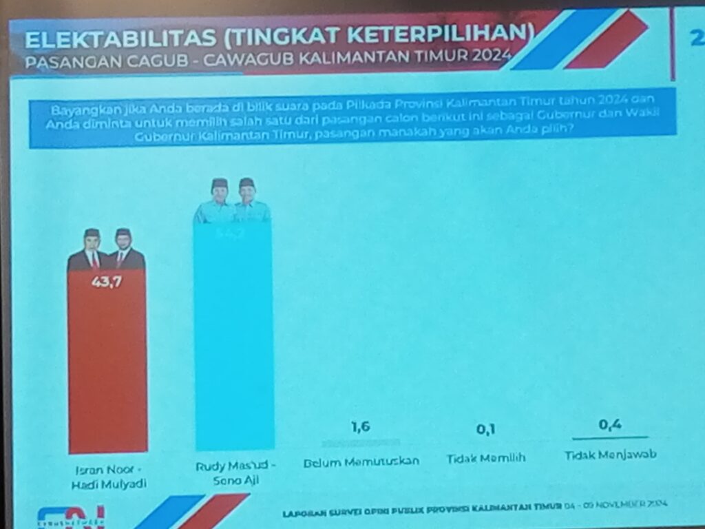 Namun, elektabilitas Isran Noor-Hadi Mulyadi, petahana, turun. Dari 52,4% pada bulan September menjadi 48,9% pada bulan Oktober, lalu turun lagi menjadi 43,7% pada awal November.
